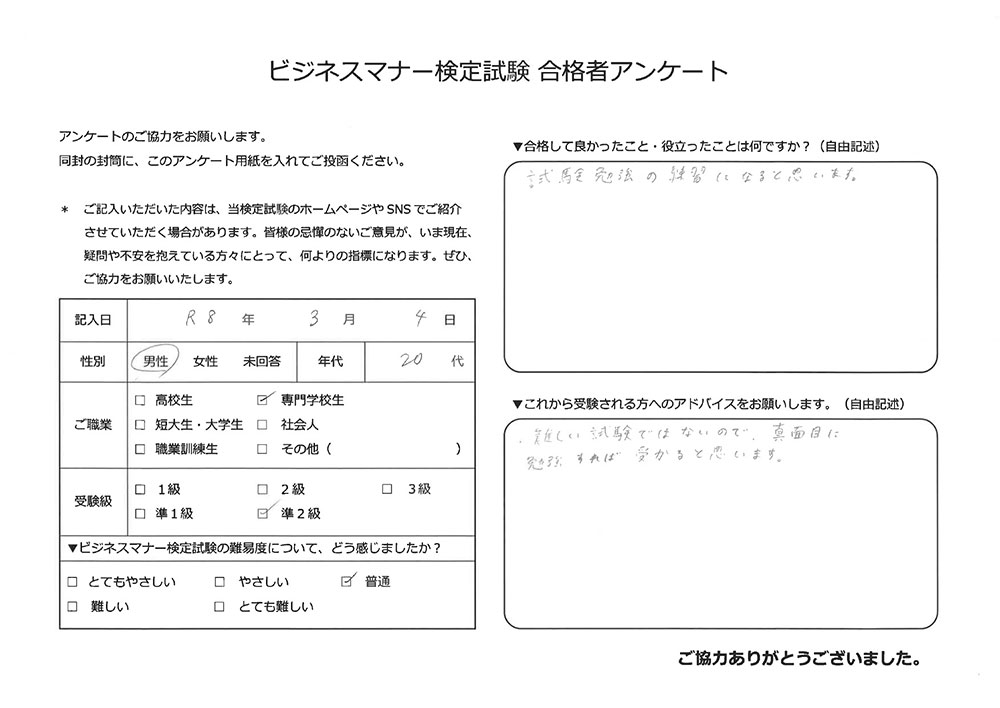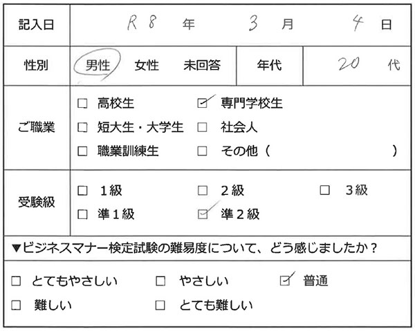 ビジネスマナー検定試験 準2級合格者の声(20代男性・専門学校生)