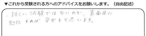 「難しい試験ではないので、真面目に勉強すれば受かると思います」